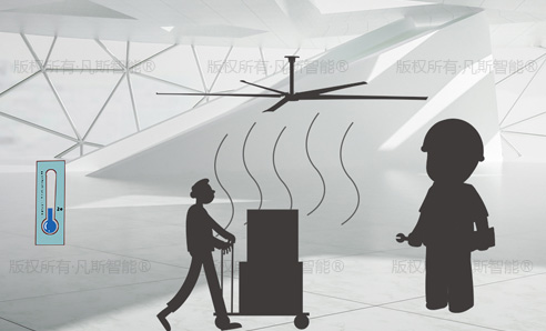 冬季采暖设备的暖空气上升停留在屋顶,地面依然寒冷,温度分层。大型吊扇可将屋顶的高温气流与下层低温气流搅动均衡,提高制暖率。